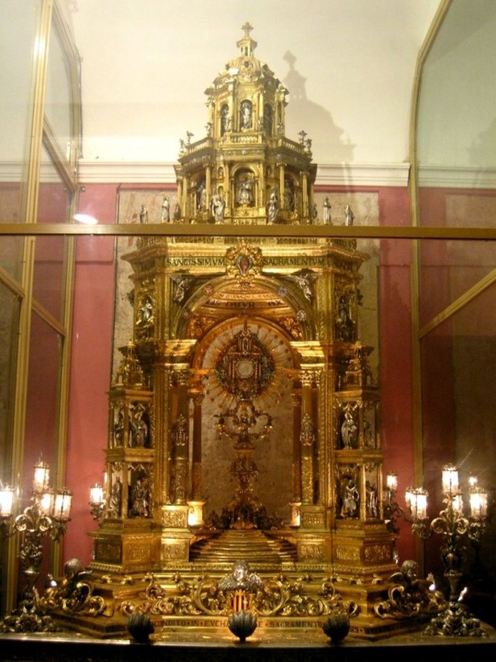 A continuación disfrutaran de una de las mayores joyas del arte sacro español, la Custodia de la ciudad, conocida como de los pobres, por ser realizada con las aportaciones que el pueblo valenciano realizo, joyas, dinero, y hasta cuberterías. Era finales de una guerra y el pueblo humilde se rindió al Santísimo Sacramento.