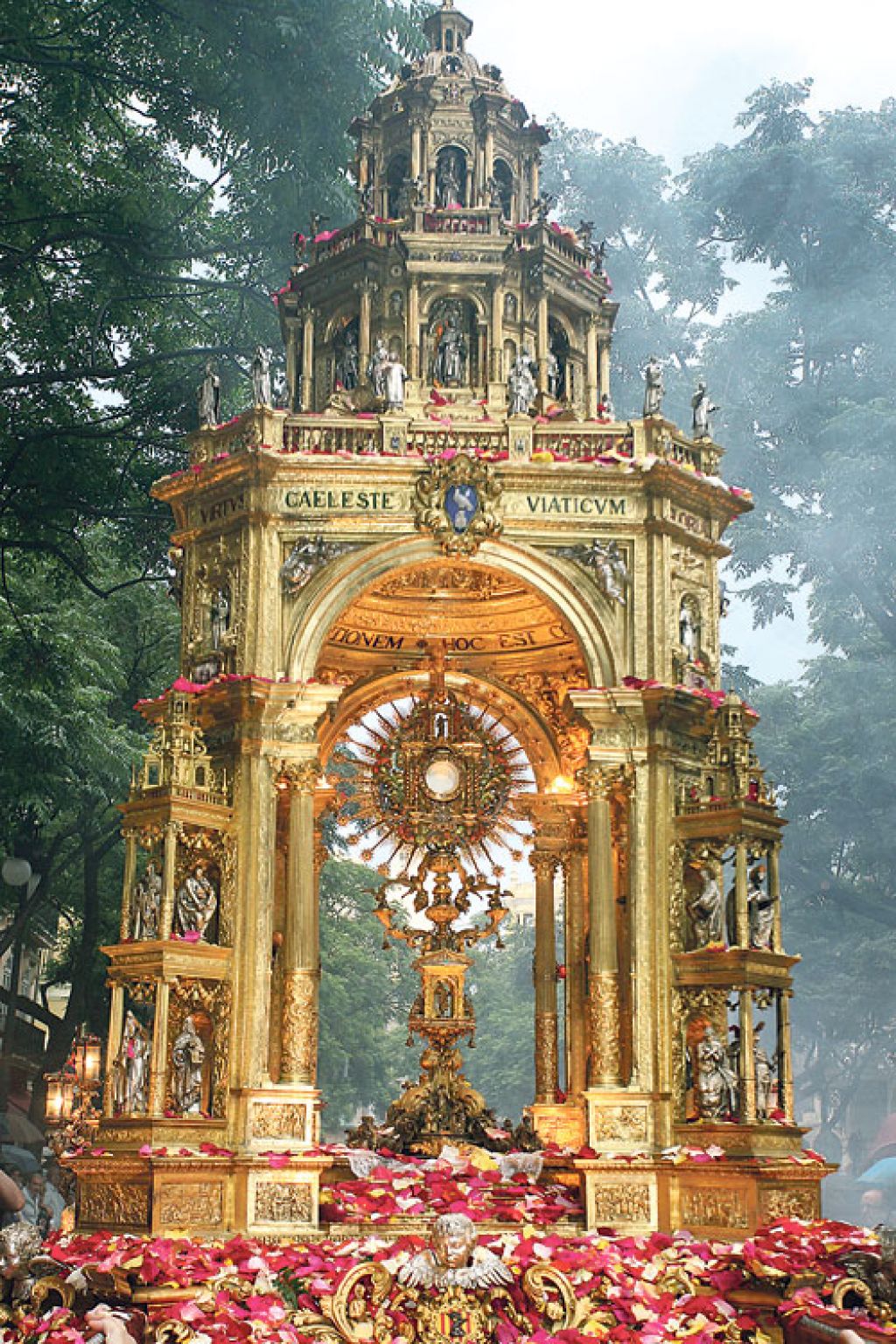 La mayor custodia procesional, mide más de 4 metros de altura y tiene una anchura de 2,26 metros. Consta de 600 kilos de plata, 75 gramos de platino y 5 kilos de oro fino, cientos de piedras preciosas y miles de perlas. Consta también de 159 imágenes cinceladas, 48 esmaltes, 44 altorrelieves y 71 campanillas de diversos tamaños.
