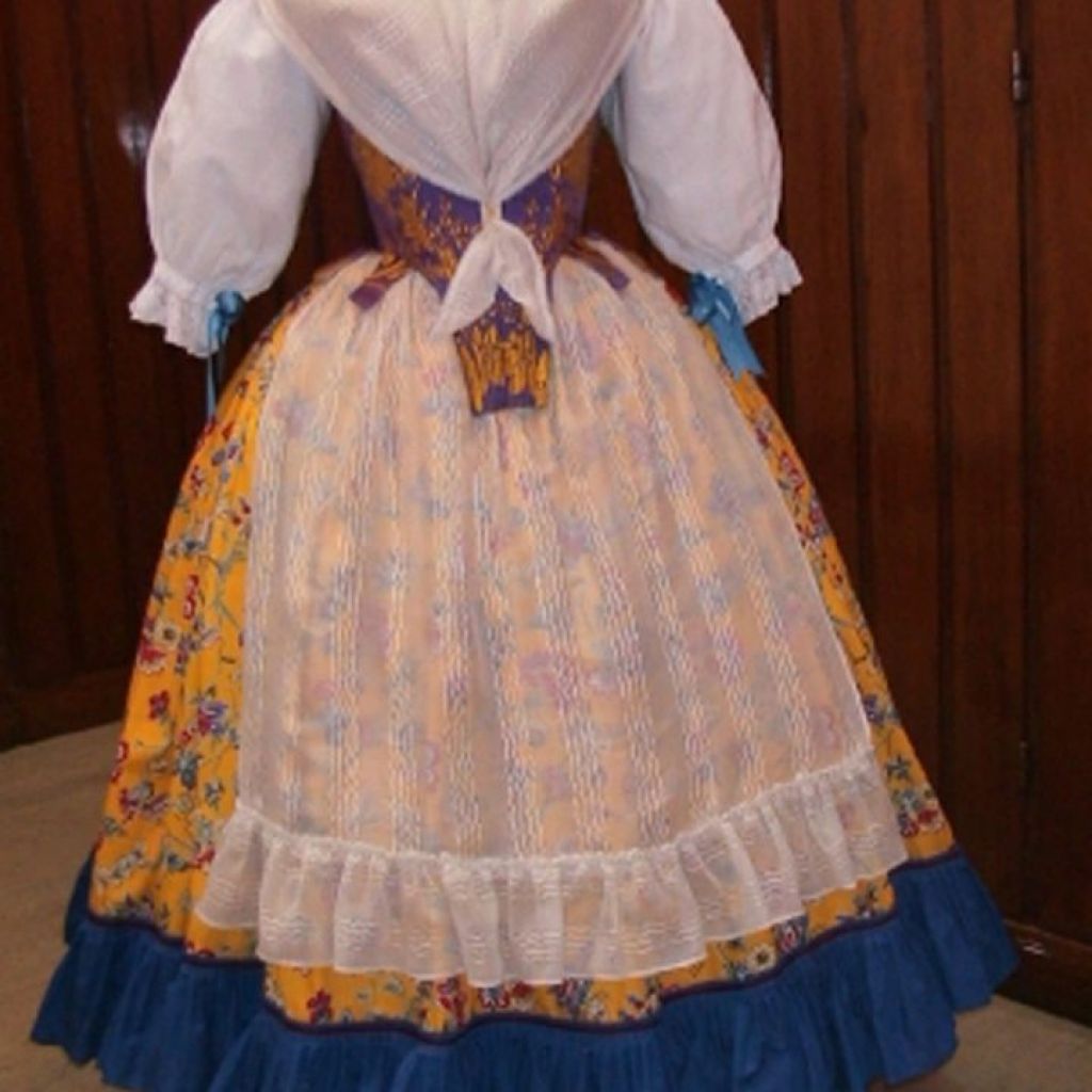 En la parte interna del bajo se colocaba un ruedo, que es una banda de tela de unos 15 cm., de ancho, de un color que contrastaba con el del guardapiés. El ruedo protegía y reforzaba el bajo.