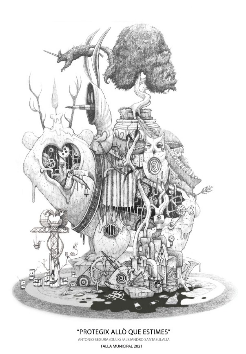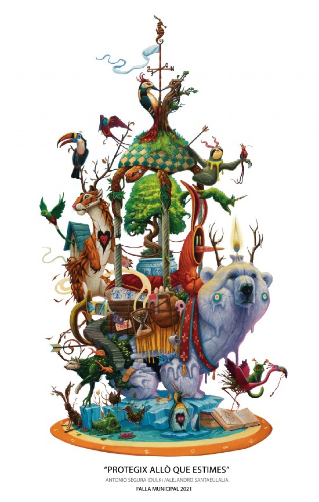 En un acto presidido por el concejal de Cultura Festiva del Ayuntamiento de València, Carlos Galiana, con la presencia de las falleras mayores de València, Consuelo Llobell y Carla García, y sus cortes de honor, el artista fallero Alejandro Santaeulalia y Antonio Segura, Dulk, uno de los artistas urbanos con más proyección en todo el mundo ahora mismo, que fueron seleccionados por un jurado integrado por representantes del mundo fallero, artístico y social de nuestra ciudad, han presentado su proyecto para la falla grande municipal del año que viene. Bajo el lema 'Protegix allò que estimes', los dos han destacado que el proyecto pone de relieve que "somos la única especie que destruimos nuestra casa" y esta falla "aúna el interés por la naturaleza y la preocupación por la conservación de las especies, construyendo un mundo con mucha realidad pero también con mucha magia". "La salud del planeta está en un momento muy delicado y somos nosotros los que nos tenemos que dar cuenta de que tenemos que hacer algo y con esta obra ponemos a València en el centro del mensaje con una falla que hace un recorrido por varios ecosistemas del planeta con muchas especies animales", han resaltado los artistas.
