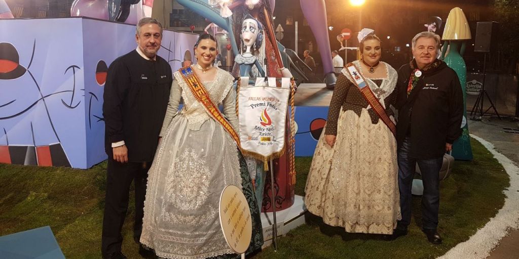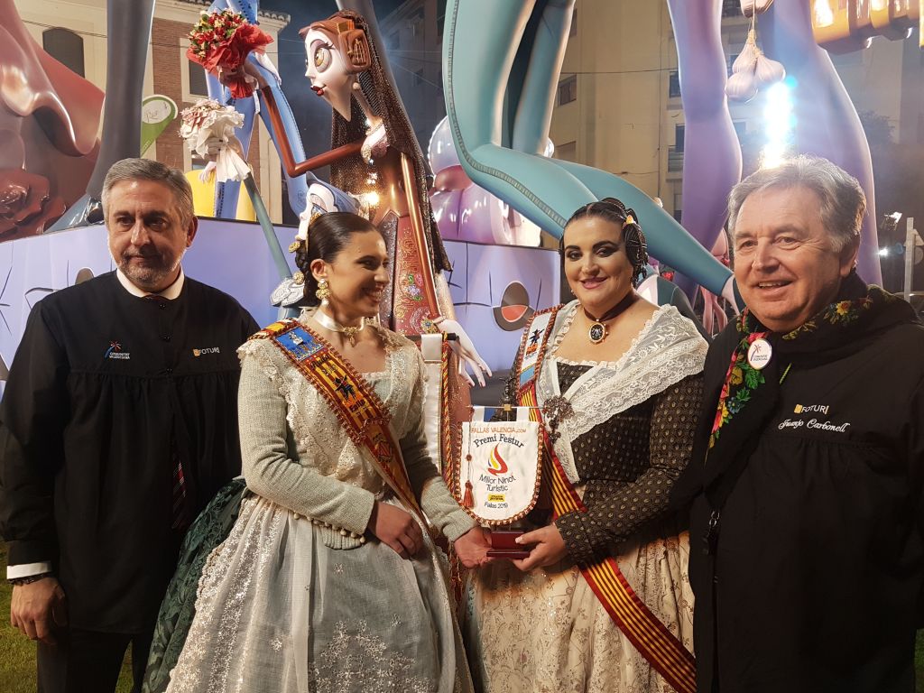 Roberto Torres director del Grupo Empresarial Digital M4B, organizador y promotor del premio, junto a Juan José Carbonell, Secretario General de FOTUR, fueron los encargados de entregar el palet a la Fallera Mayor de Arzobispo Olaechea - San Marcelino, Paula Navarro, y a la Presidenta de la falla, Silvia Atienza.