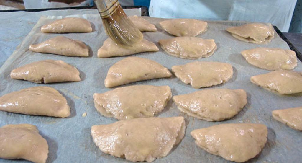 Por último, para formar el pastel de boniato, la masa se trabaja en caliente. Extenderla en porciones de forma redonda (un vaso puede hacer de molde), sobre una superficie lisa y aceitada. Rellenar con la pasta de boniato y cerrar. Sellar los extremos presionando con un tenedor. Pintar con el huevo batido para que después de hornear quede brillante. Introducir al horno, previamente calentado y cocer a temperatura fuerte 220º durante 25 minutos.