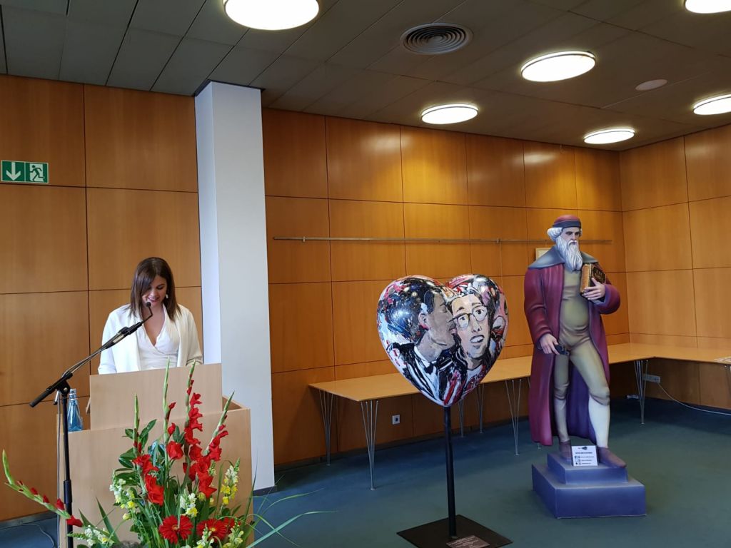 Por su parte, Mainz también ha querido obsequiar a València y ha hecho entrega de uno de los 50 corazones realizados por artistas locales para recaudar fondos para la investigación sobre el cáncer infantil; un corazón diseñado por Alfonso Mannella, que, por un lado, lleva ilustrada una escena de Mainz en la que aparece Gutenberg y la catedral, y por el otro está representado el beso de Basquiat a Keith Haring en una foto de George Hirose: un beso en la sien, que para él representa la amistad y la convivencia respetuosa más allá de las fronteras del sexo, del color de la piel y la nacionalidad.