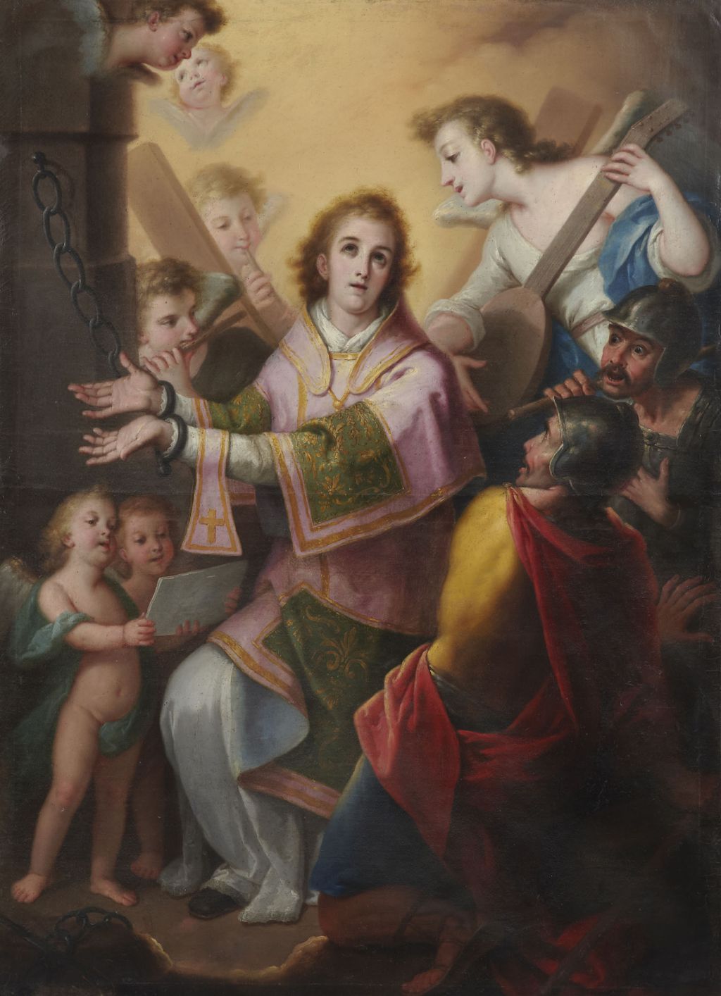 La escena “refleja el momento en el que el santo es reconfortado por un coro de ángeles cantores y músicos justo antes de su martirio y ante la mirada perpleja de sus carceleros”, según Sancho, que ha señalado que “se trata de un san Vicente imberbe, casi adolescente, con sus manos atadas con cadenas de hierro”.