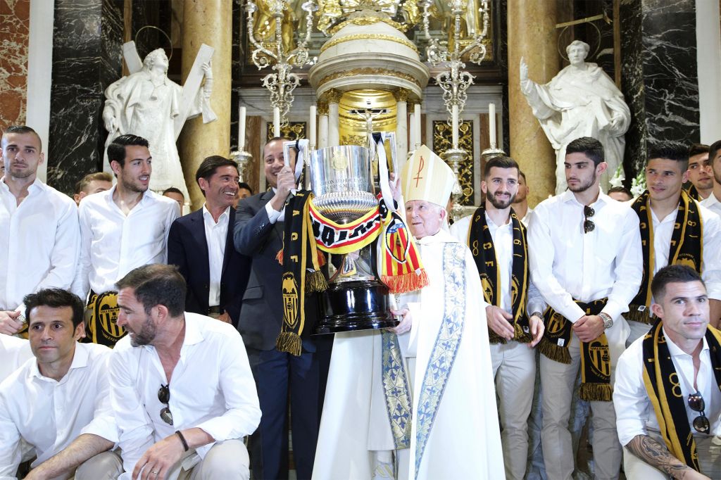 El Valencia CF. ha ofrecido esta tarde a la patrona de Valencia, la Virgen de los Desamparados, ante centenares de seguidores que abarrotaban la Basílica de la Virgen, la Copa del Rey que consiguió el pasado sábado frente al Barcelona.